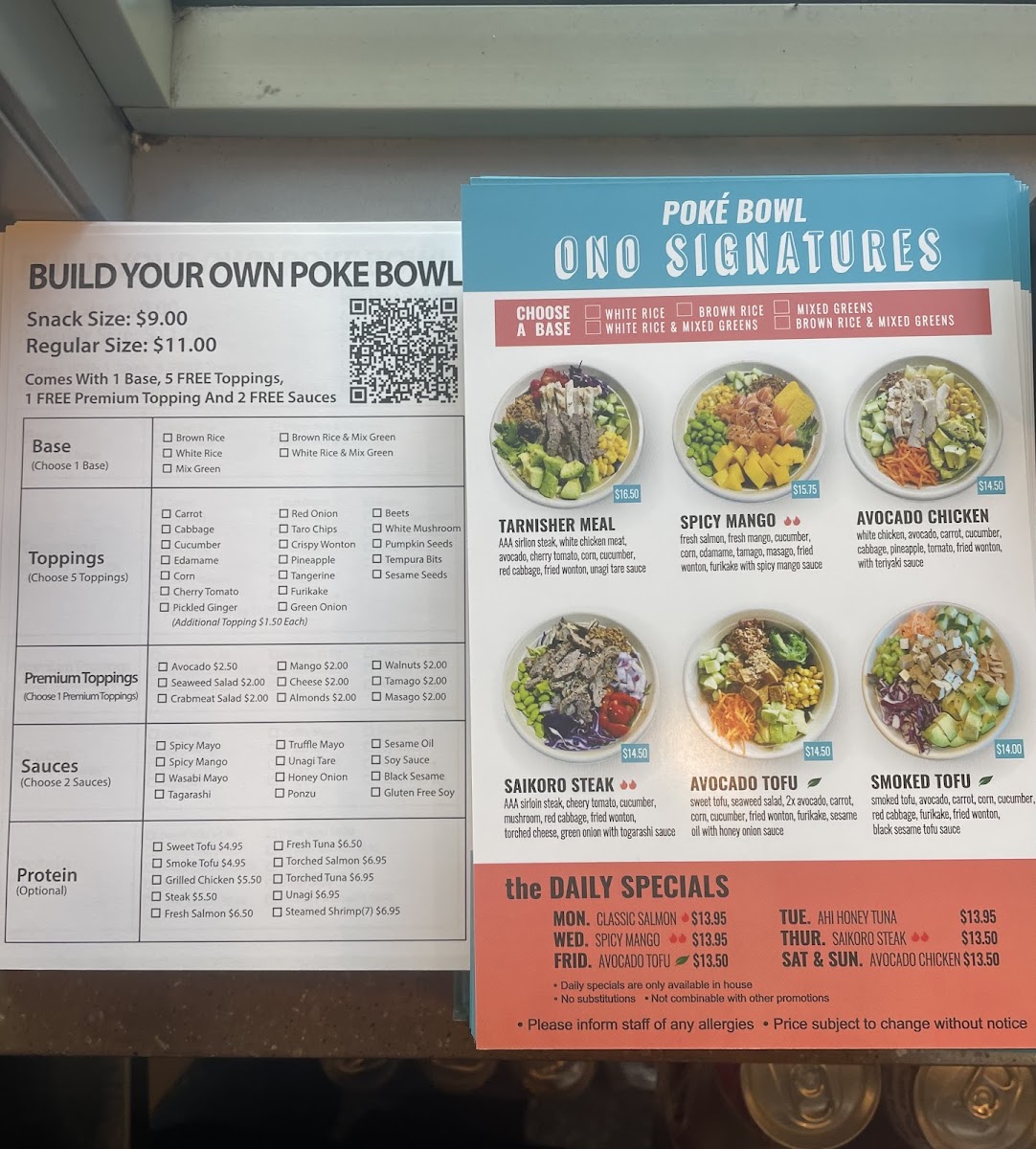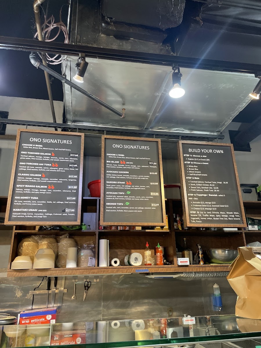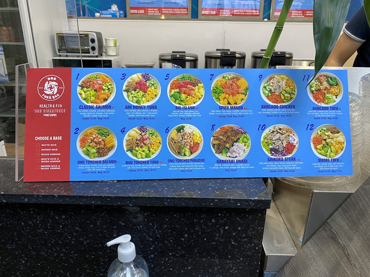 The menu at Ono Poké Bar offers a variety of flavorful options that cater to different tastes. For those looking for something unique, the 'Ono Torched Salmon and 'Ono Torched Ahi Tuna are standout choices, both known for their rich flavors, while the Ahi Honey Tuna Big Island and Classic Salmon provide classic, refreshing options. If you prefer a more personalized experience, the Build Your Own Bowl (Large) and Build Your Own Bowl (Small) allow you to select your own ingredients for a truly custom creation. To complement the main dishes, you can enjoy sides like Taro Chips or Taro Nachos for an added crunch. For drinks, the restaurant offers a selection of refreshing beverages including Arizona Green Tea, Gatorade, Sparkling Bottled Water, Bottled Water, and Nestea. Whether you're in the mood for something signature or a customized bowl, Ono Poké Bar provides a satisfying and versatile menu to explore.