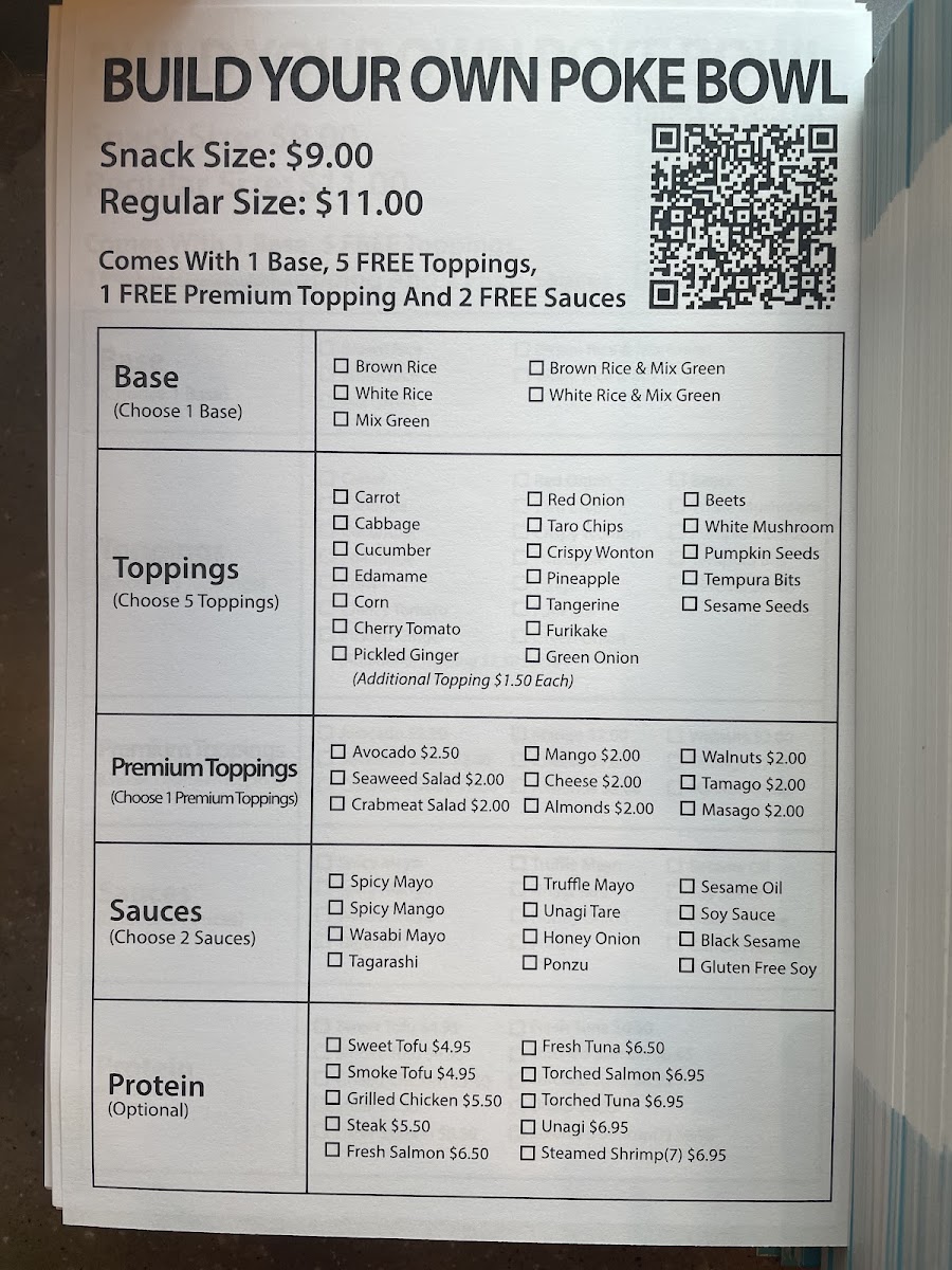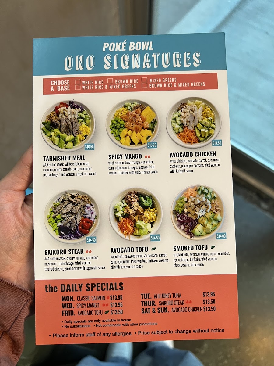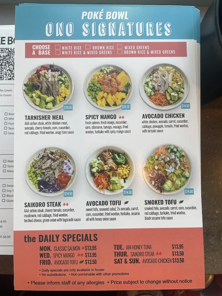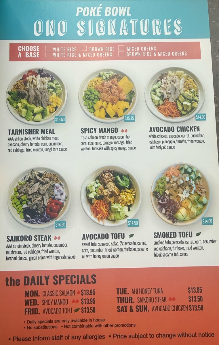 The menu at Ono Poké Bar offers a variety of flavorful options that cater to different tastes. For those looking for something unique, the 'Ono Torched Salmon and 'Ono Torched Ahi Tuna are standout choices, both known for their rich flavors, while the Ahi Honey Tuna Big Island and Classic Salmon provide classic, refreshing options. If you prefer a more personalized experience, the Build Your Own Bowl (Large) and Build Your Own Bowl (Small) allow you to select your own ingredients for a truly custom creation. To complement the main dishes, you can enjoy sides like Taro Chips or Taro Nachos for an added crunch. For drinks, the restaurant offers a selection of refreshing beverages including Arizona Green Tea, Gatorade, Sparkling Bottled Water, Bottled Water, and Nestea. Whether you're in the mood for something signature or a customized bowl, Ono Poké Bar provides a satisfying and versatile menu to explore.
